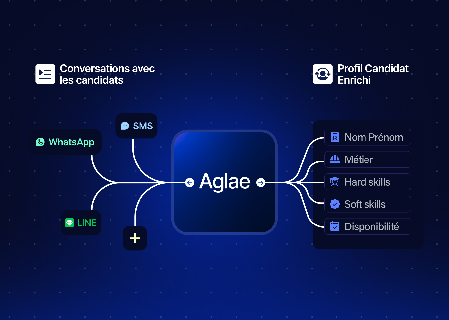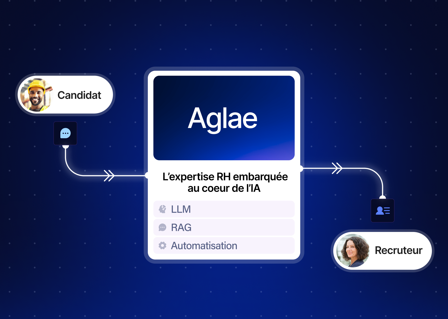 Aglae repose sur une architecture d’agents IA conversationnels exploitant les derniers modèles de langage (Large Language Model – LLM). Elle interagit directement avec les candidats par SMS ou autres canaux.